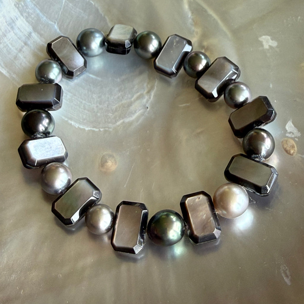 Very unique bangle made of stunning Tahitian pearls and rectangular beads of Black Lip Mother of Pearl - The flat surfaces are a pearly light grey color with darker coloured edges. They are an angular rectangle shape with a flat back measuring approximately 9 x 14 mm