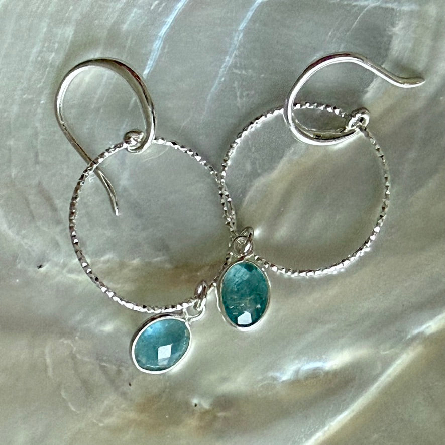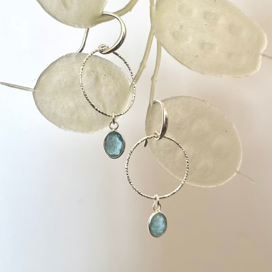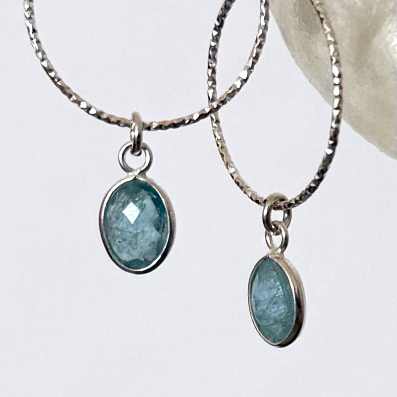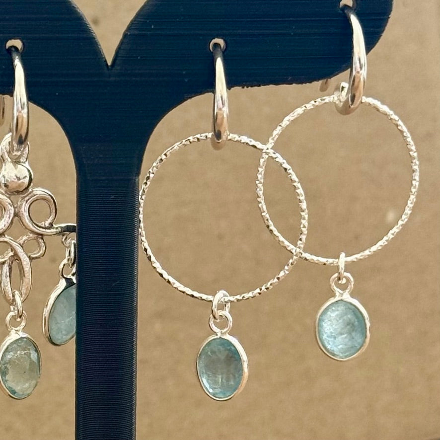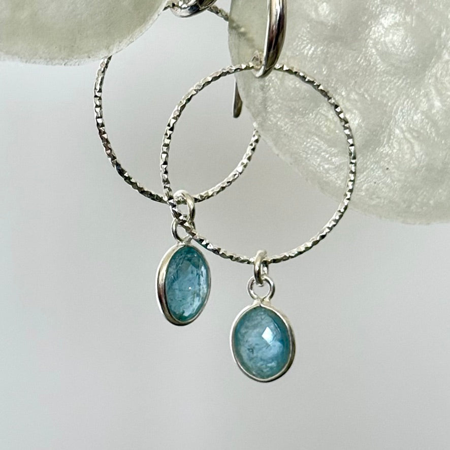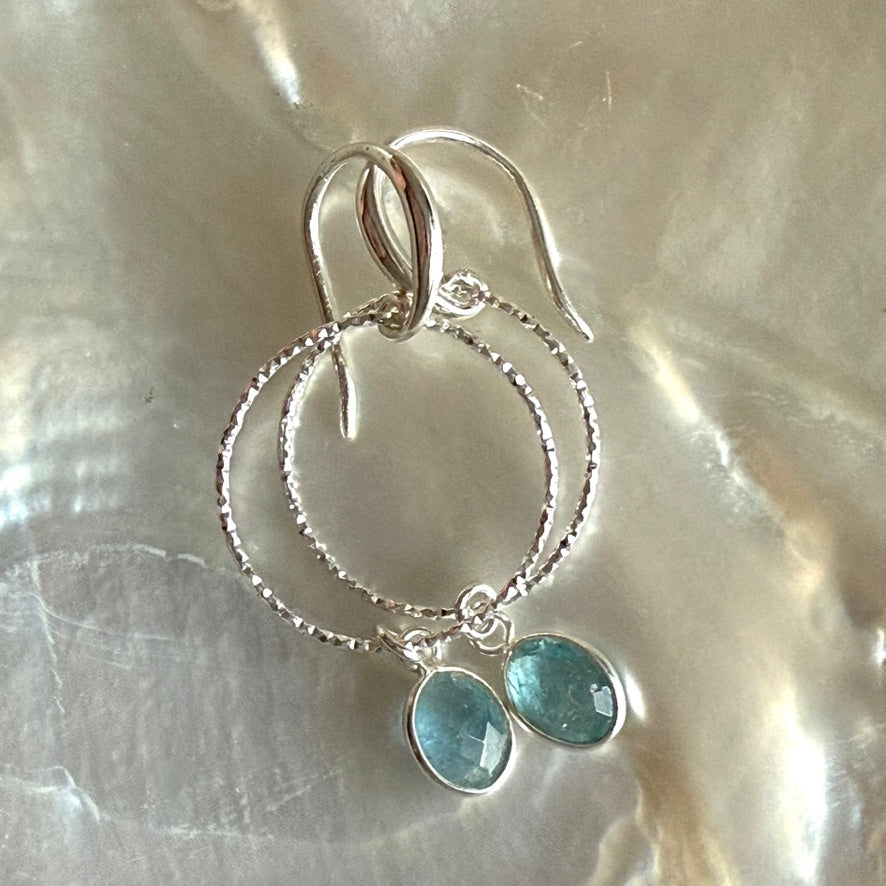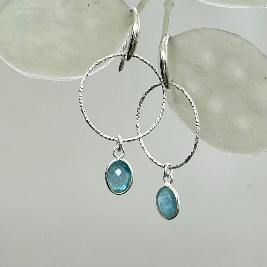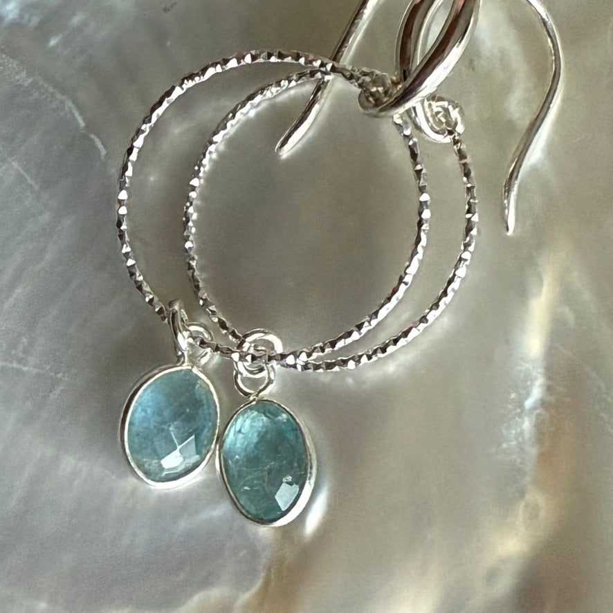 Lightweight drop earrings with a laser cut silver hoop with an LMS ear wire and a lovely blue Aquamarine oval drop, faceted on both sides to give added sparkle