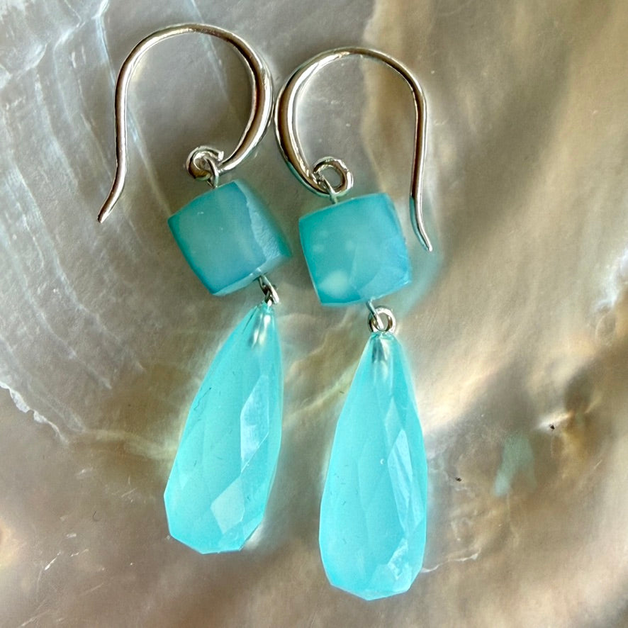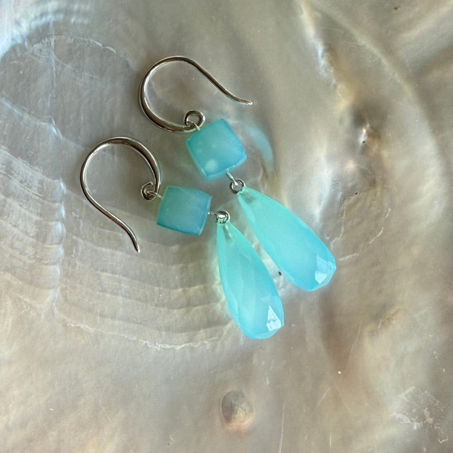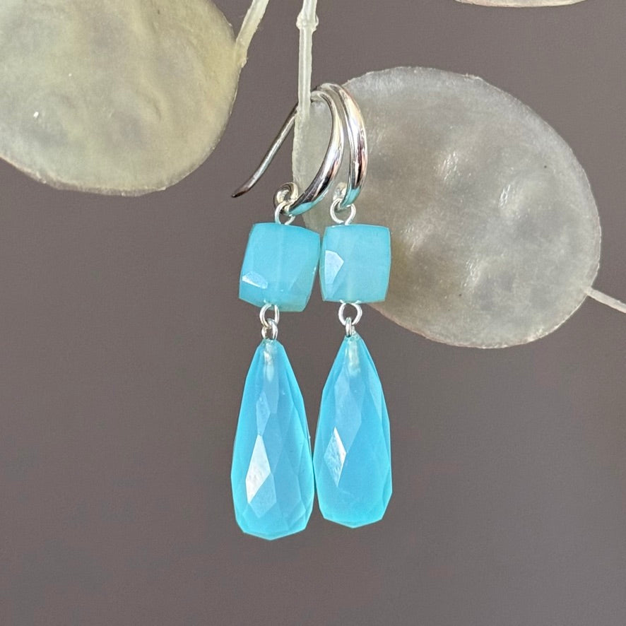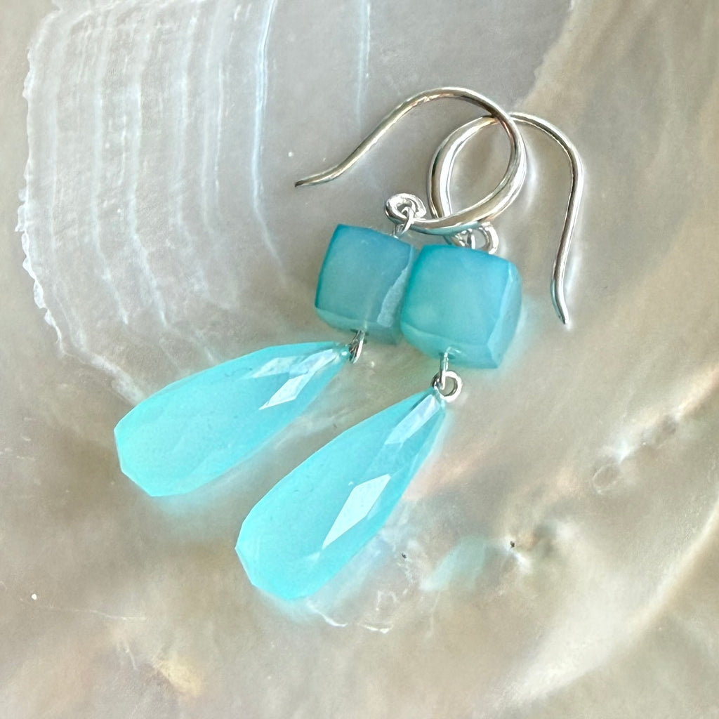Natural ocean blue Chalcedony faceted 3D cubes and a faceted drop, hang from an LMS ear wire - this exceptional gem literally glows like crystal waters!