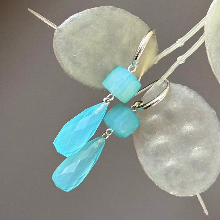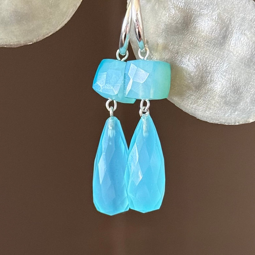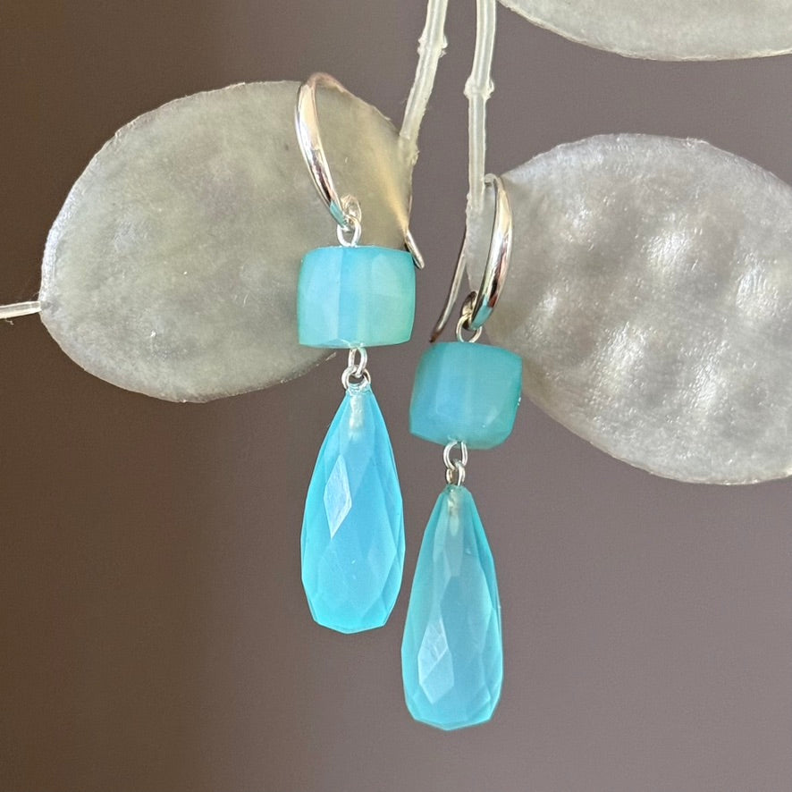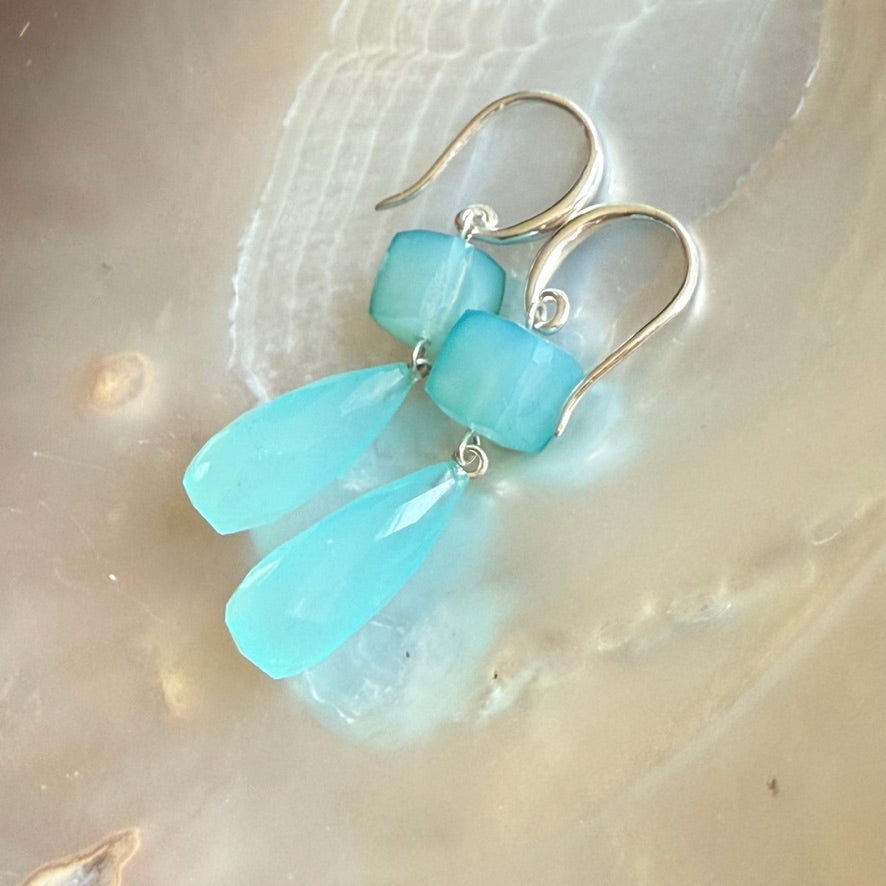 Natural ocean blue Chalcedony faceted 3D cubes and a faceted drop, hang from an LMS ear wire - this exceptional gem literally glows like crystal waters!
