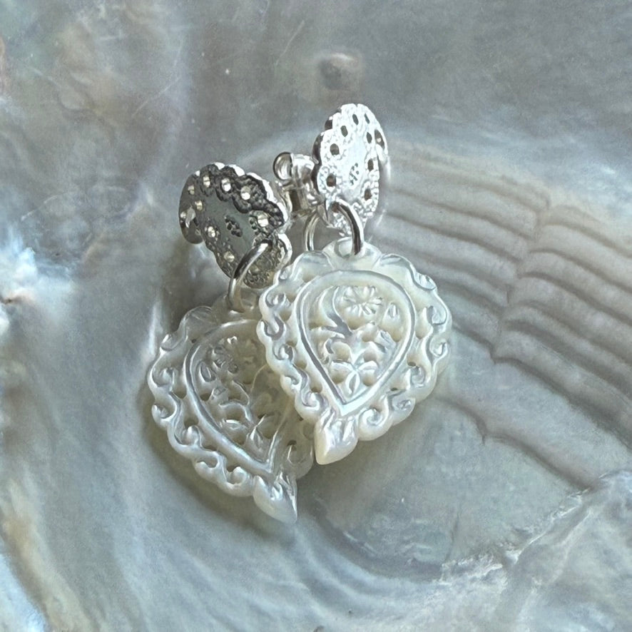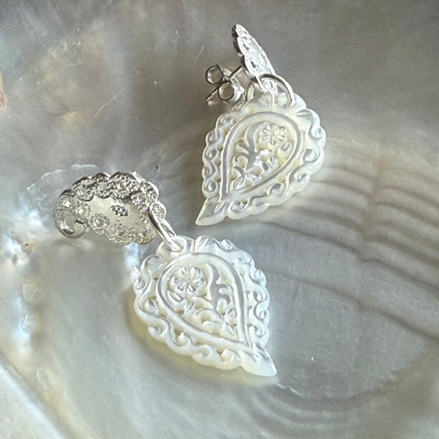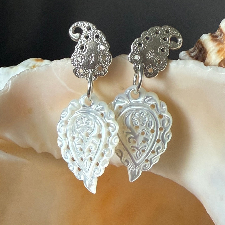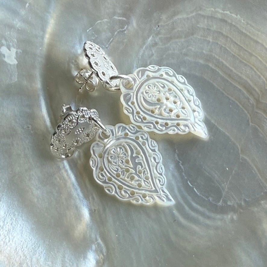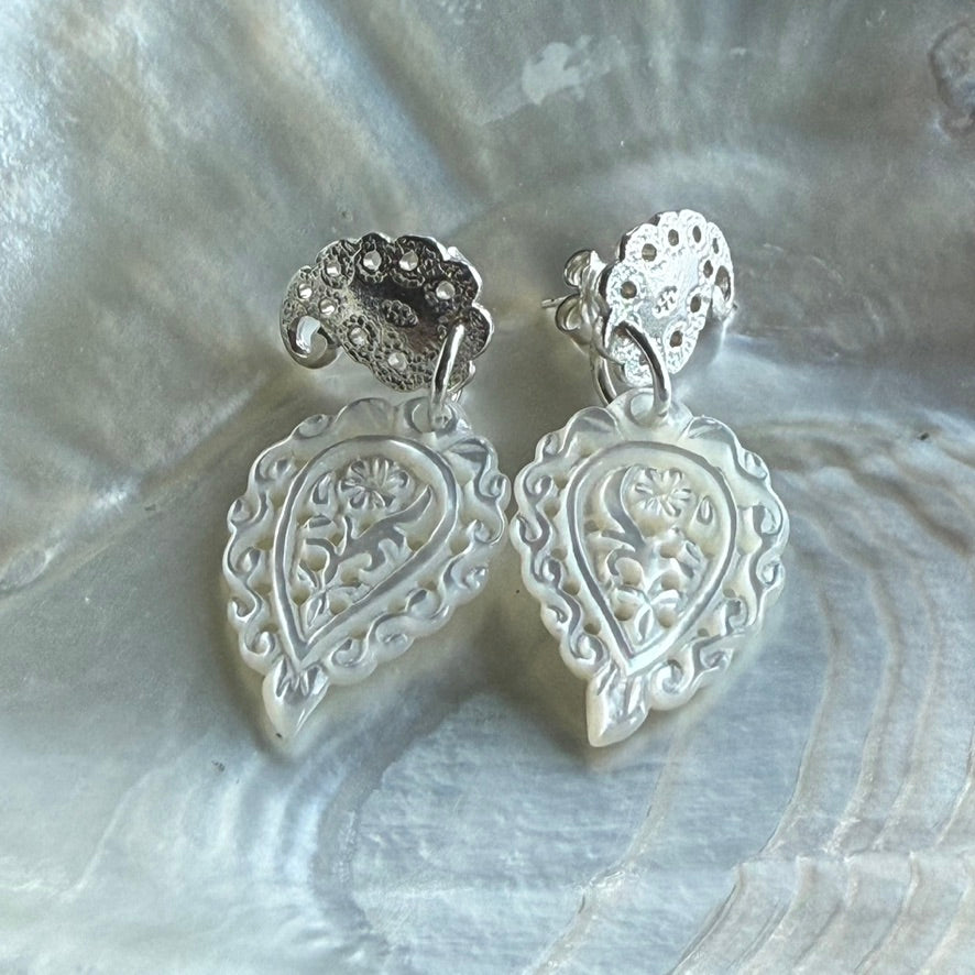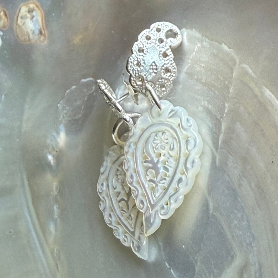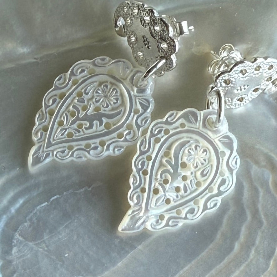 Brilliant iridescent white hand carved Mother of Pearl Paisley drops, hang from this unique Paisley in solid silver with decoration and texture - the perfect combination for these unusual earrings