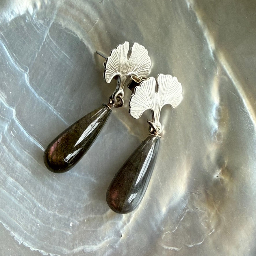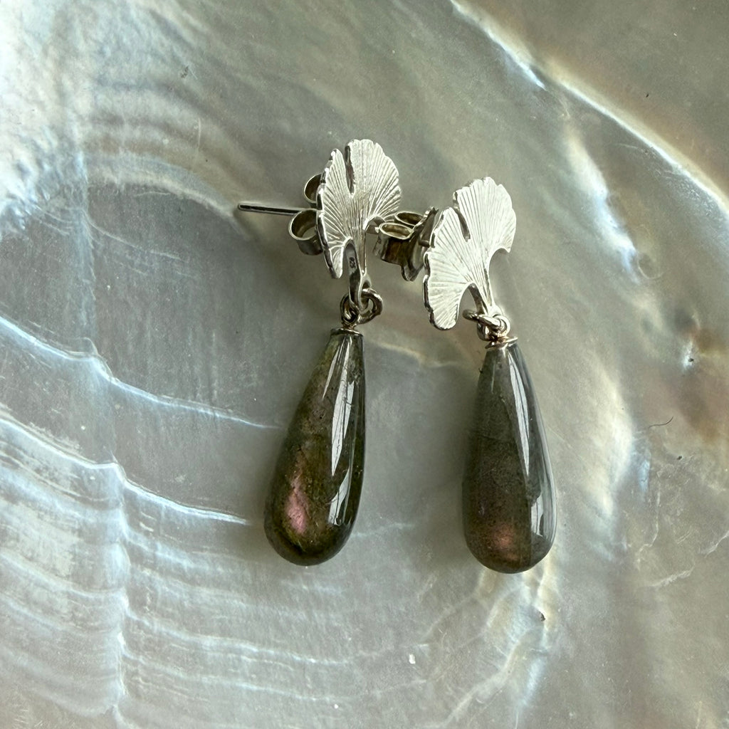 Delicate Ginkgo leaves in silver with a drop of Labradorite gem