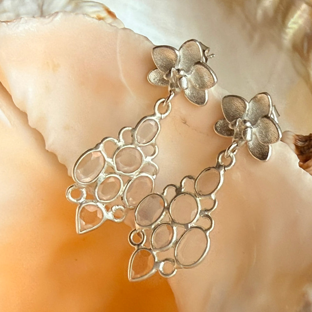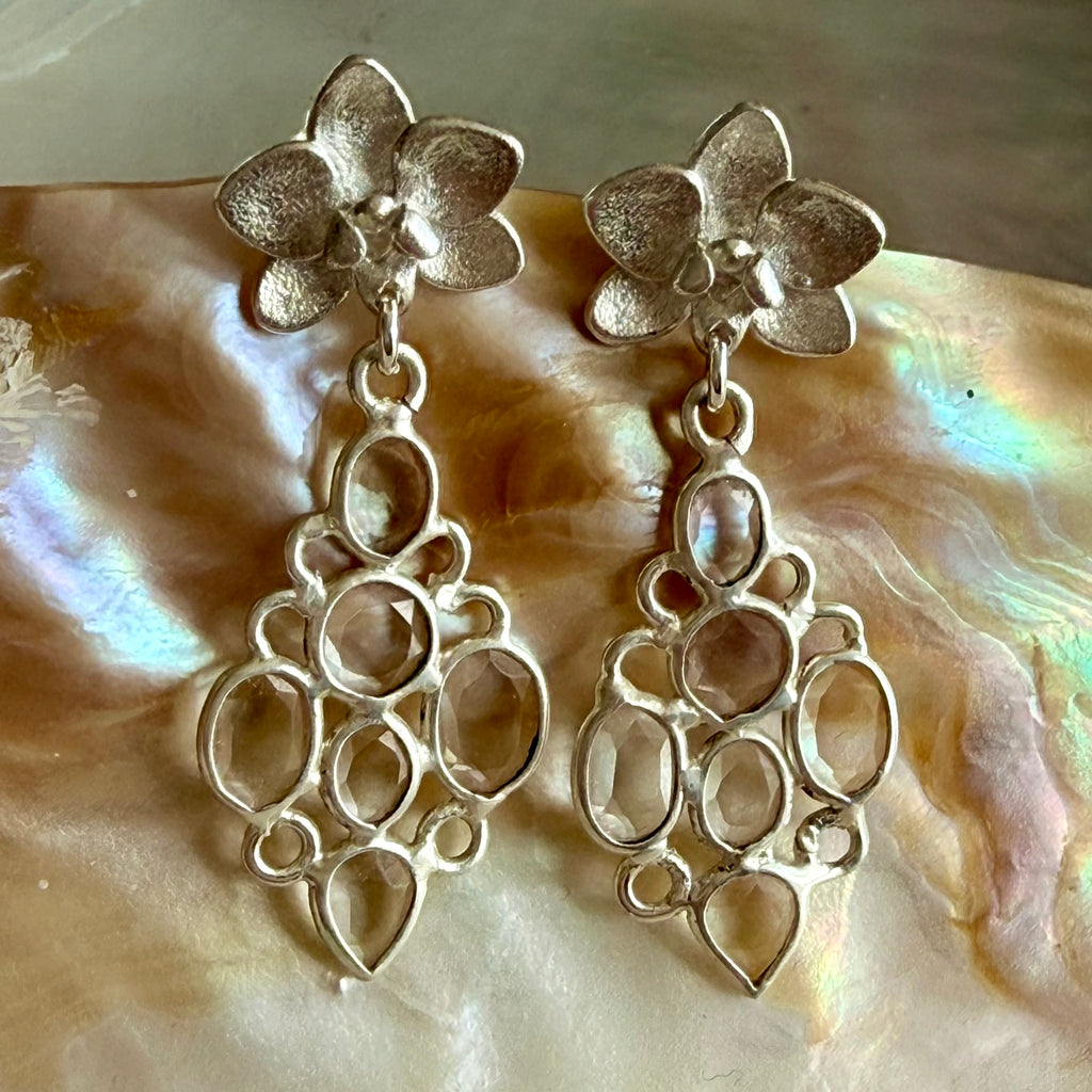 Rainbow-like sparkle emanates from these facet cut Moissanite gems swinging below little orchid studs