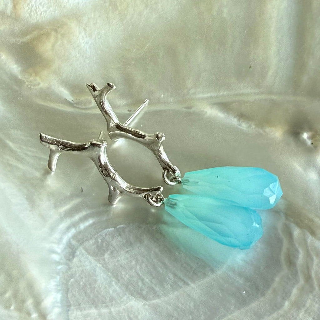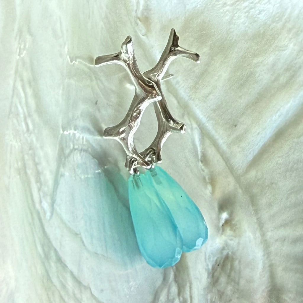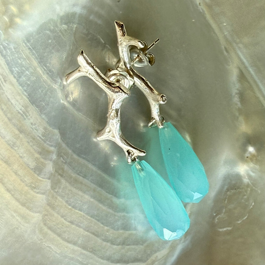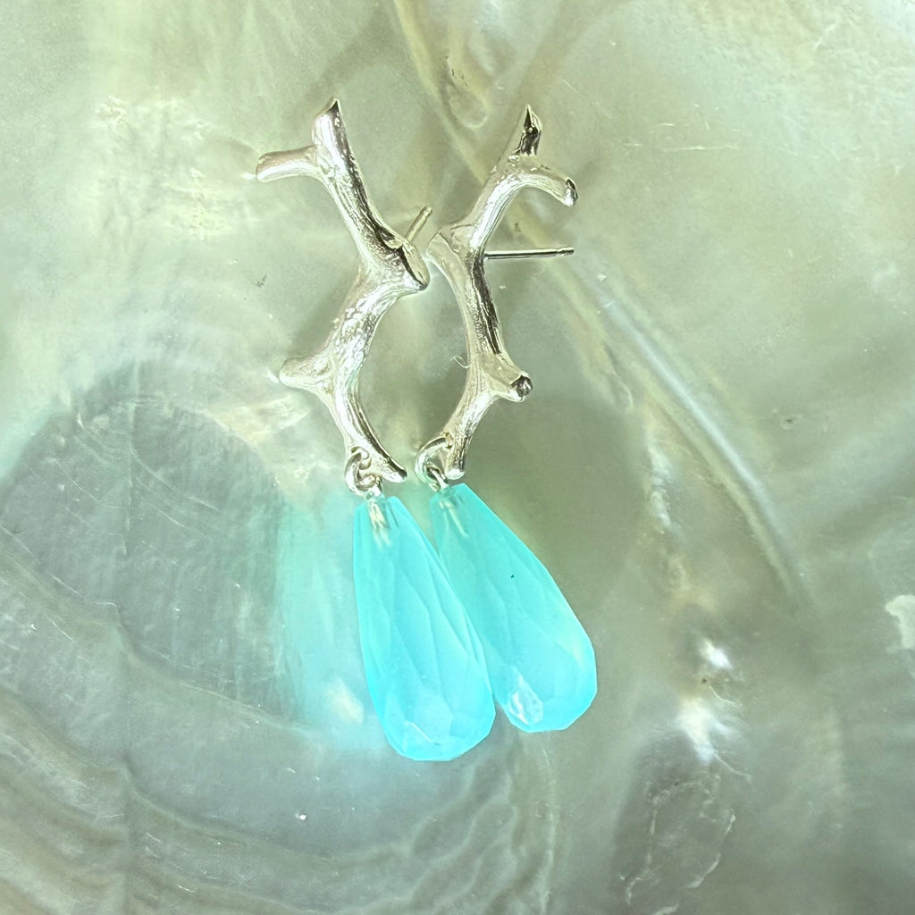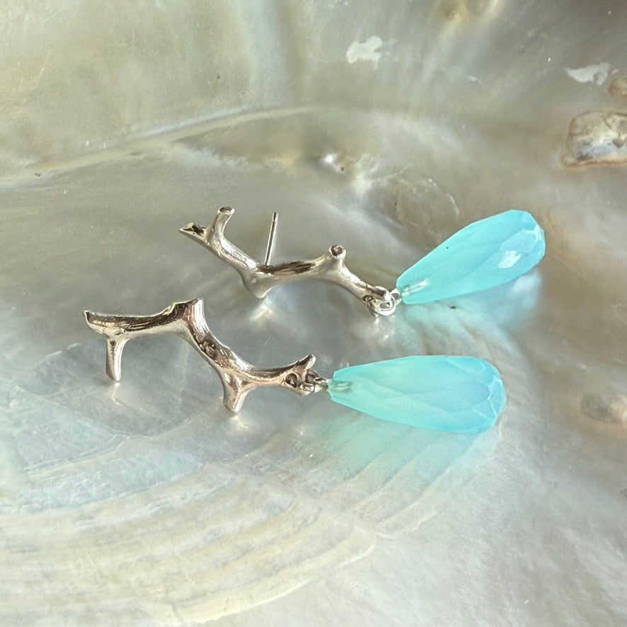 Stunning Aqua Chalcedony faceted teardrops with a luminous blue glow, hang from these Silver tops cast from real Coral