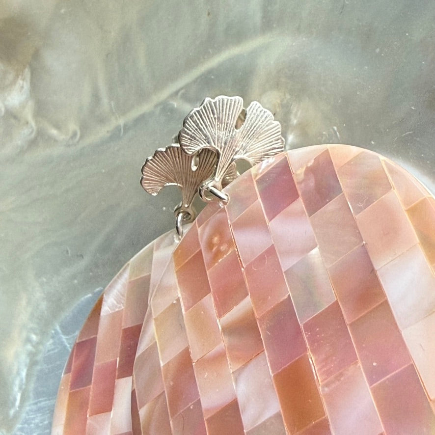 Cut and laid into a checkerboard, they shimmer and gleam with pink and peach pearly Iridescent lustre, with hints of cyan blue! Backed with a milky white disc of MoP