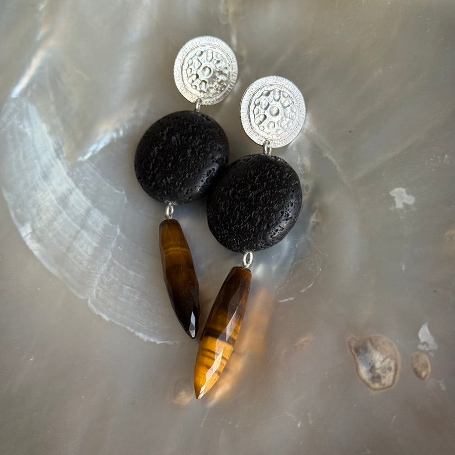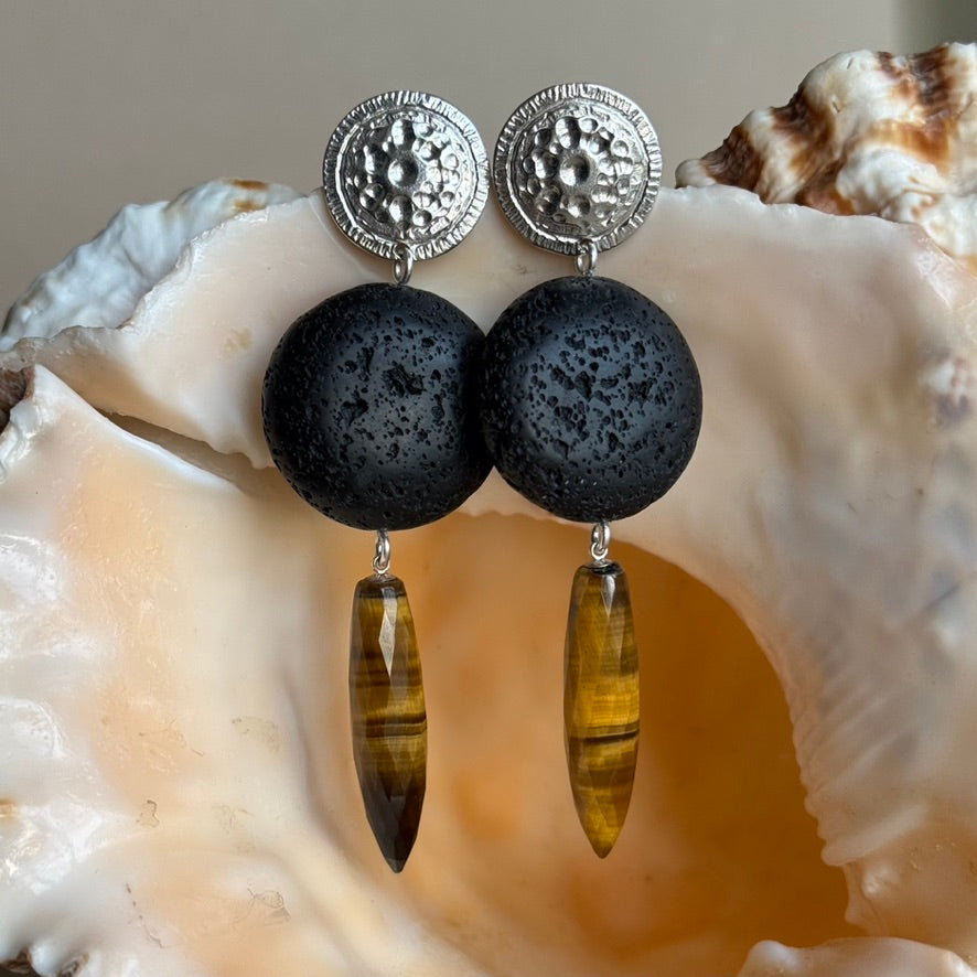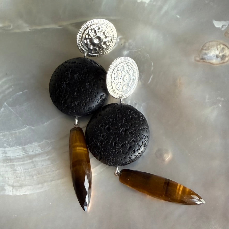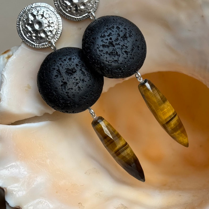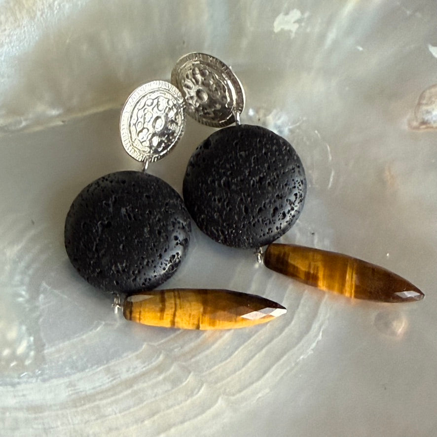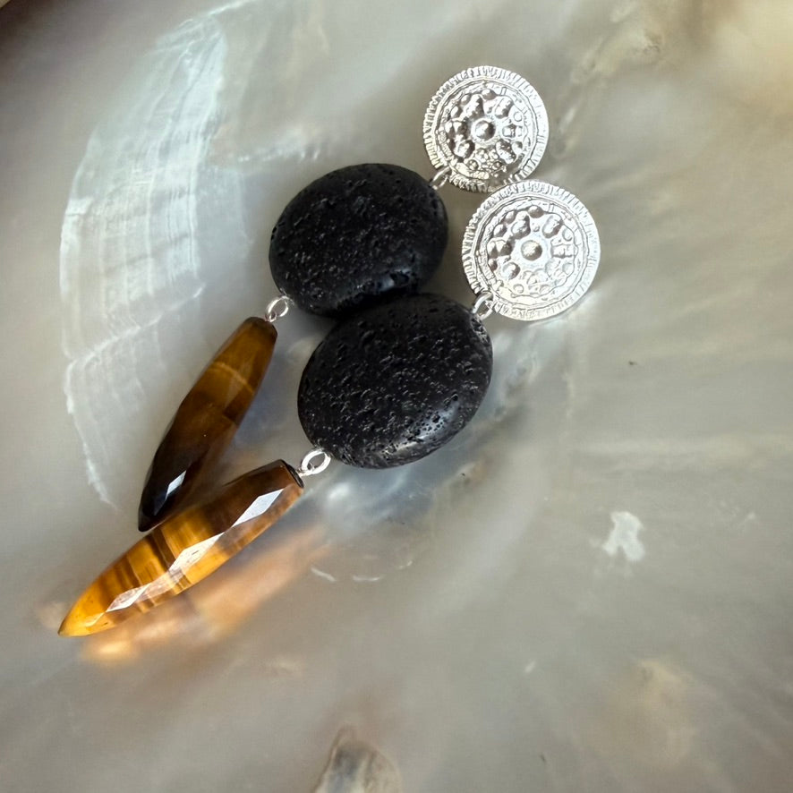 With this dome is a large elliptical bead of black Lava stone and a truly amazing honey Tiger Eye faceted drops - 30 x 8mm