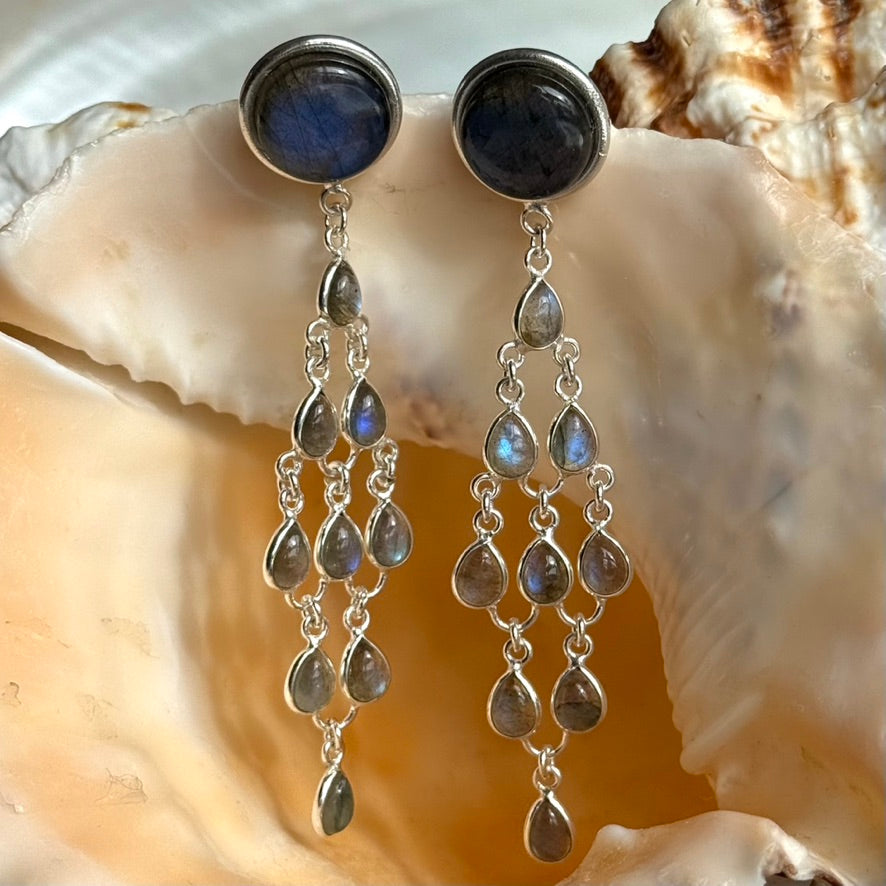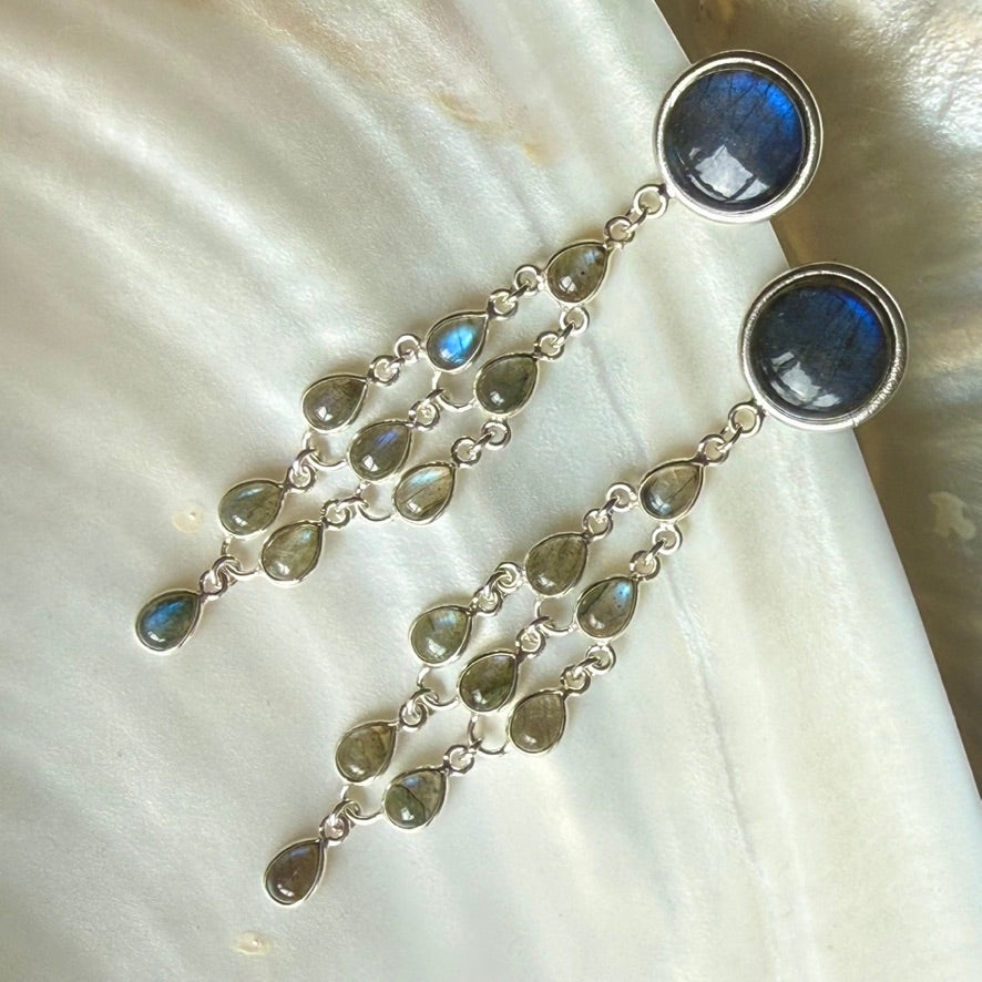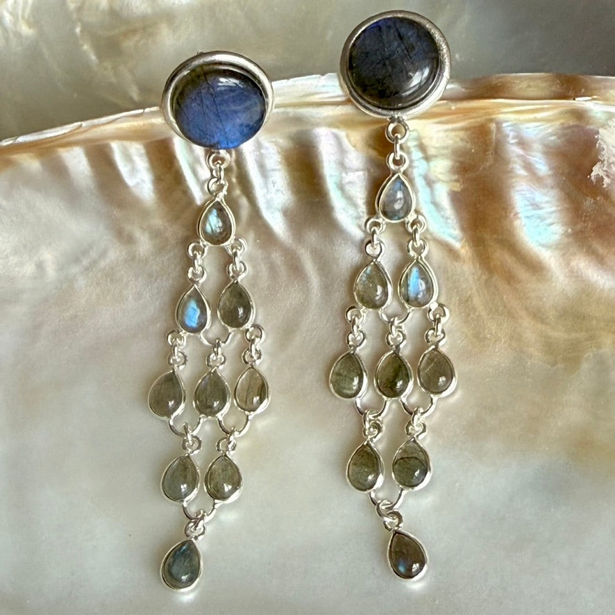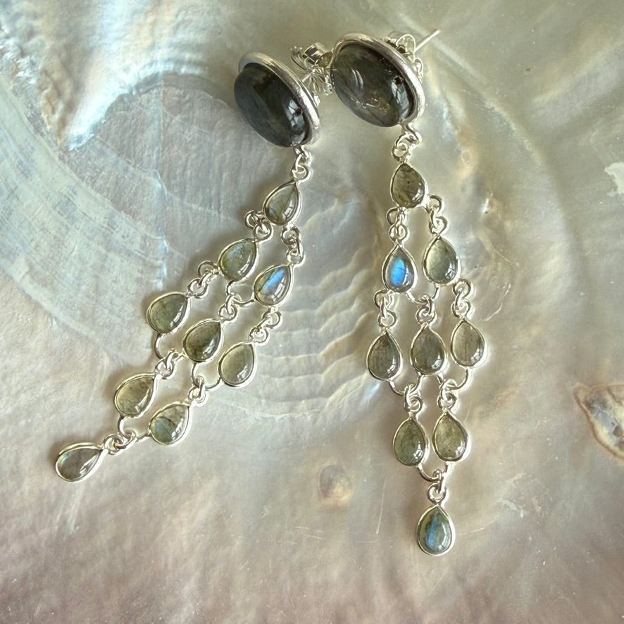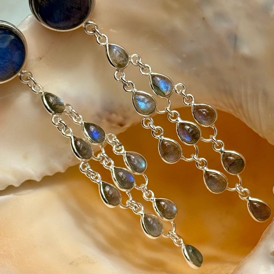 Swaying below is a cascade of little pear drops of blue flash Labradorite, also set in Silver