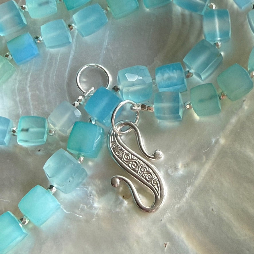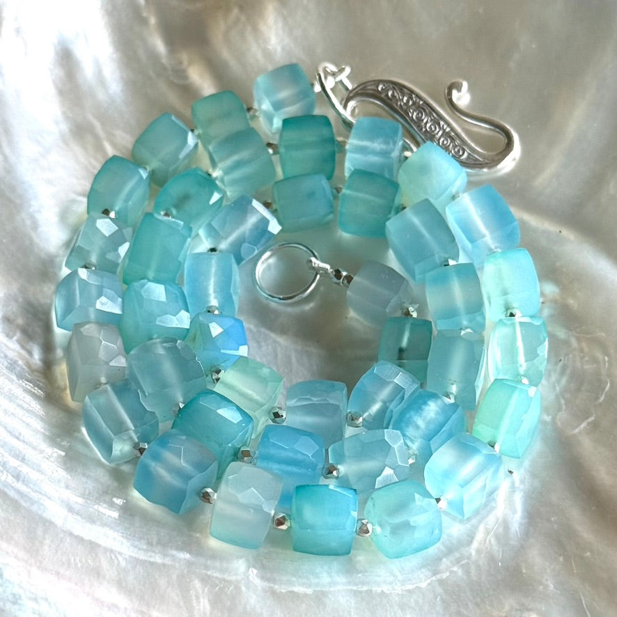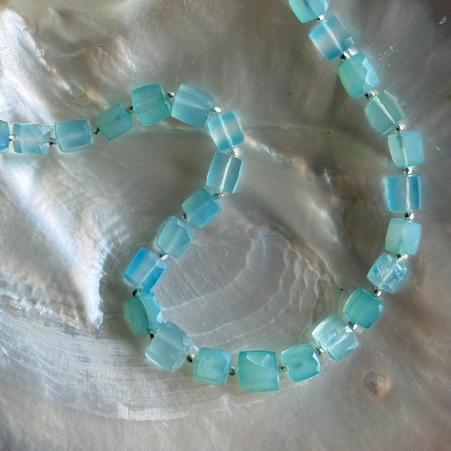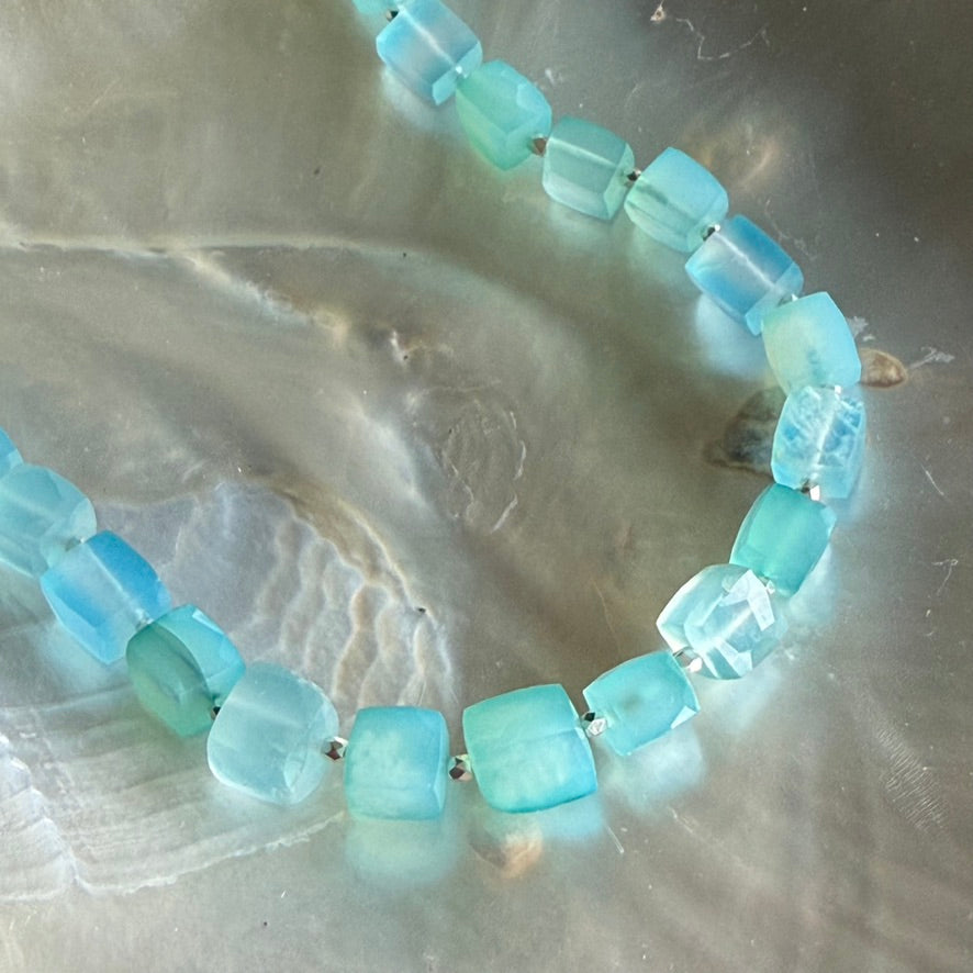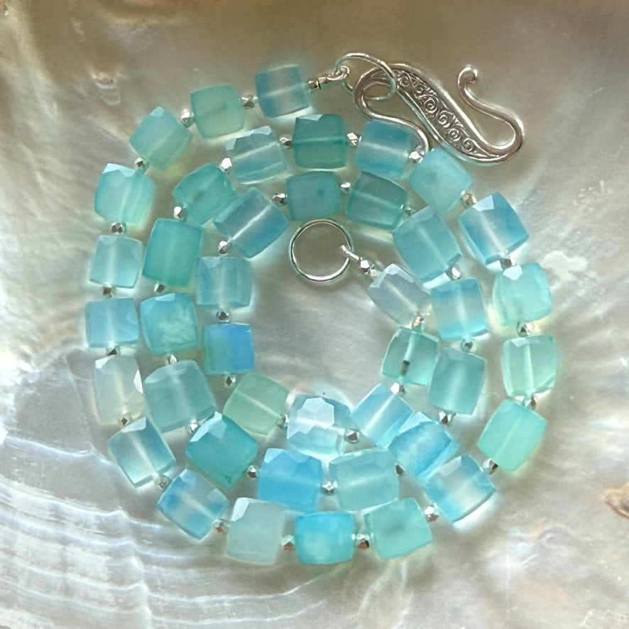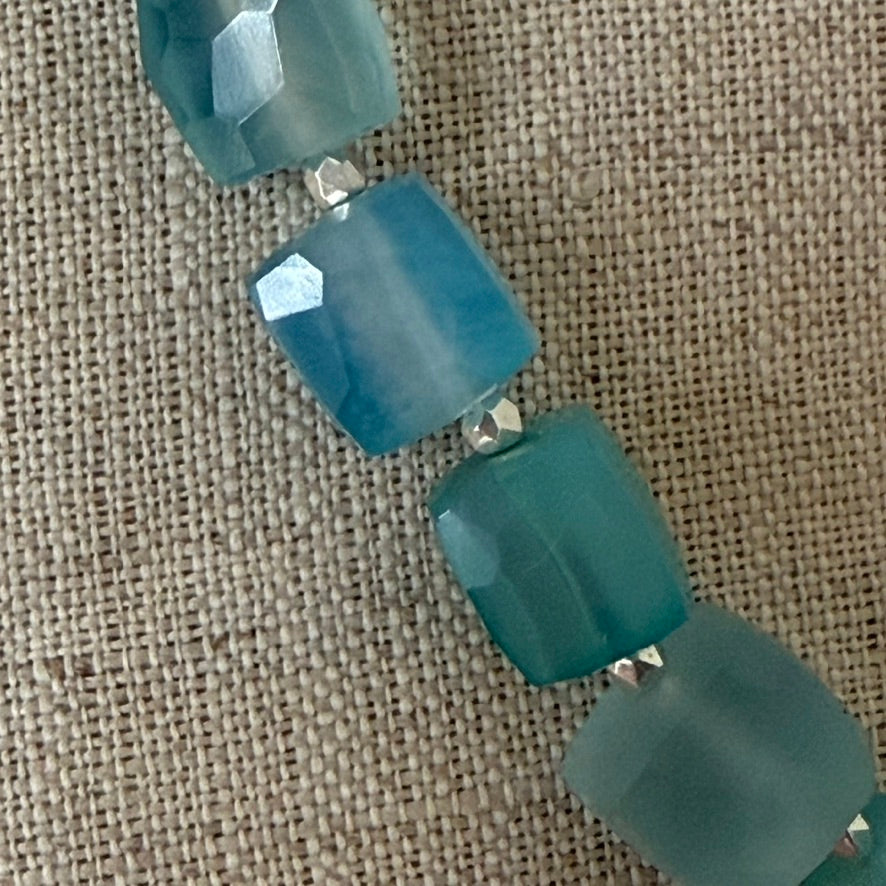 Dazzling ocean Aqua AAA Chalcedony faceted cubes with a luminous, watery blue glow, are interspersed with tiny Czech fire-polished silver glass faceted beads