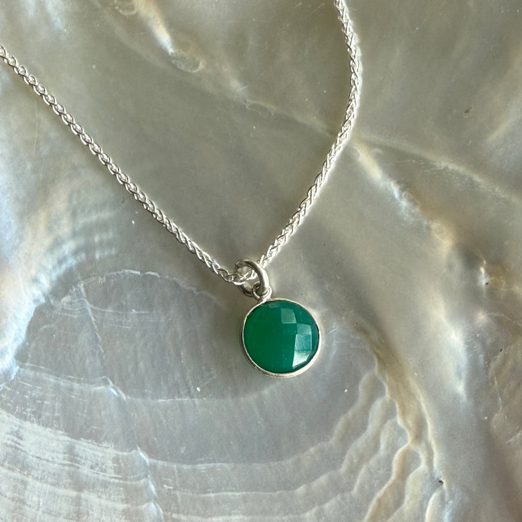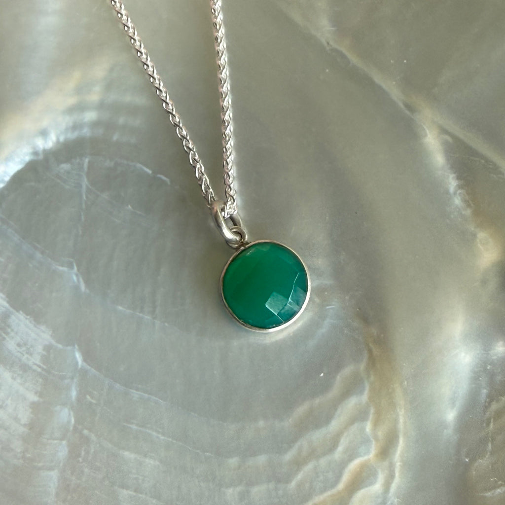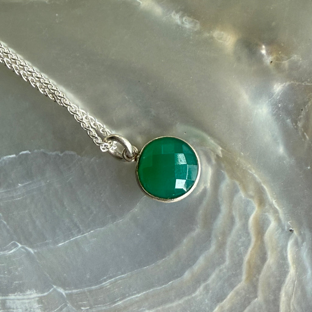 Sterling silver bezel set green Onyx round pendant, faceted on both sides, hangs simply from an 18" Spiga chain with a trigger clasp