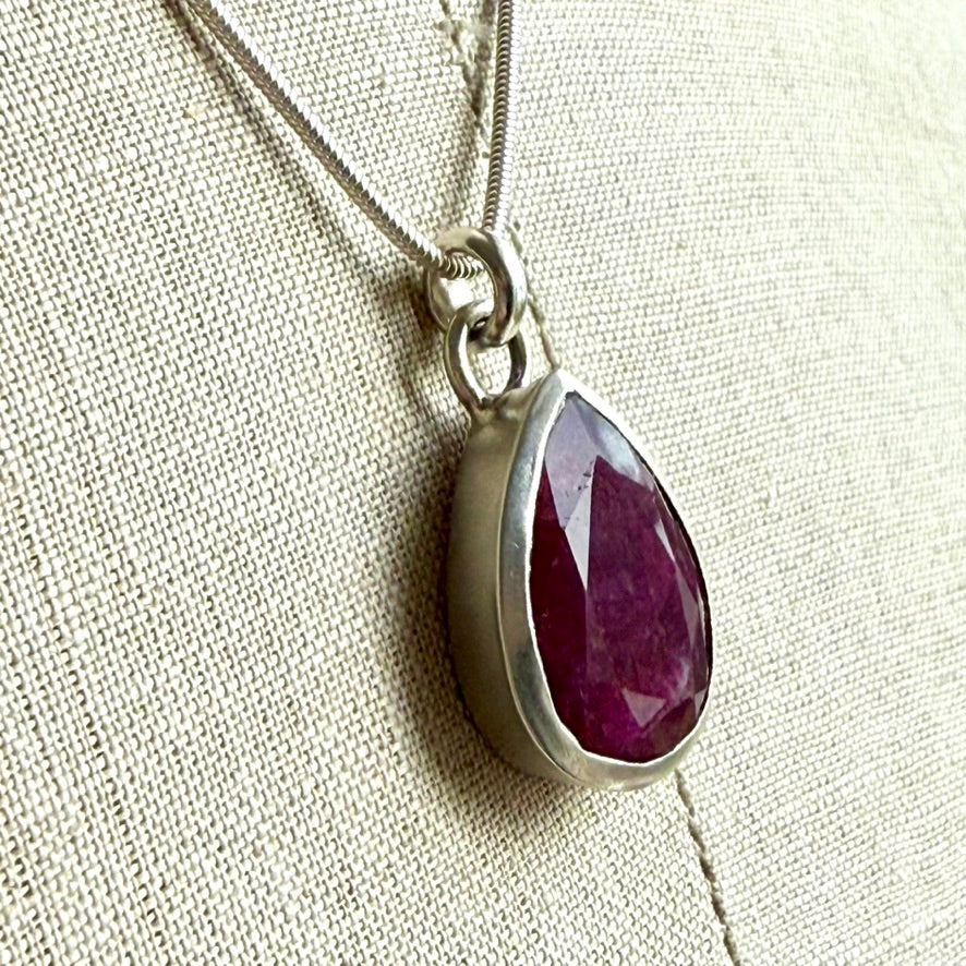 Deep raspberry pink Indian Ruby - faceted and set in silver