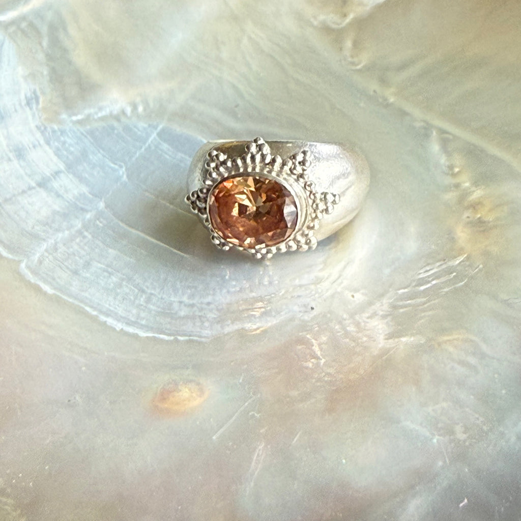 Solid, smooth textured bombe ring with a rub-over hand set 12 x 10mm Cubic Zirconia in dreamy peach tourmaline colour that sits in an oval of tiny granules that fan out into eight trios to form a star *