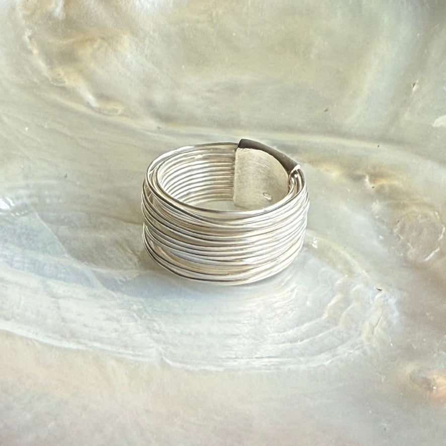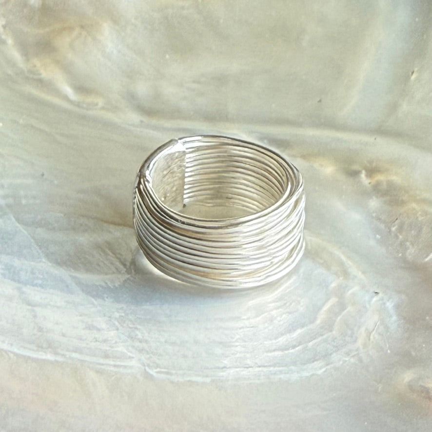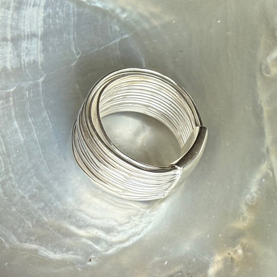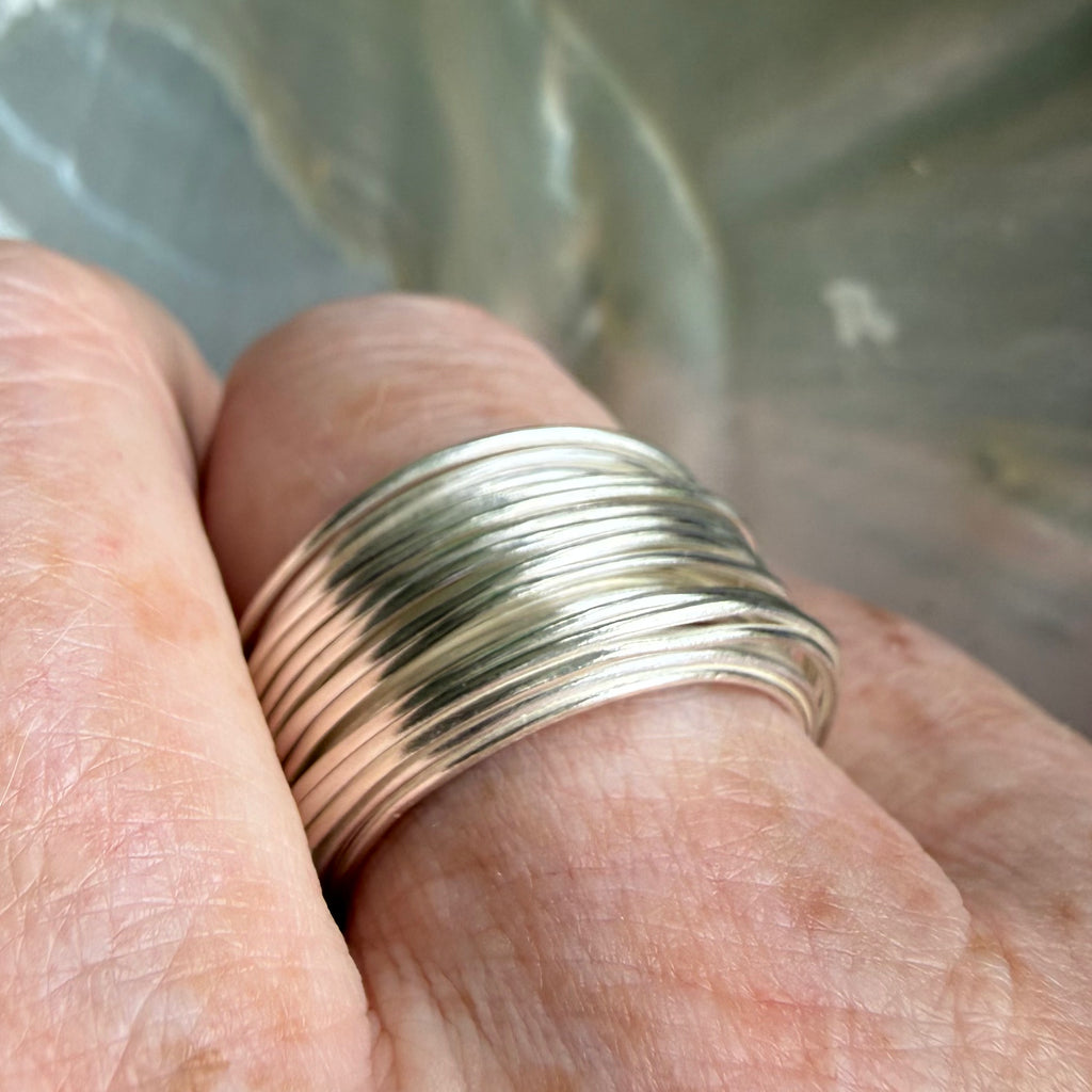 Layers of silver wire, encircling the finger