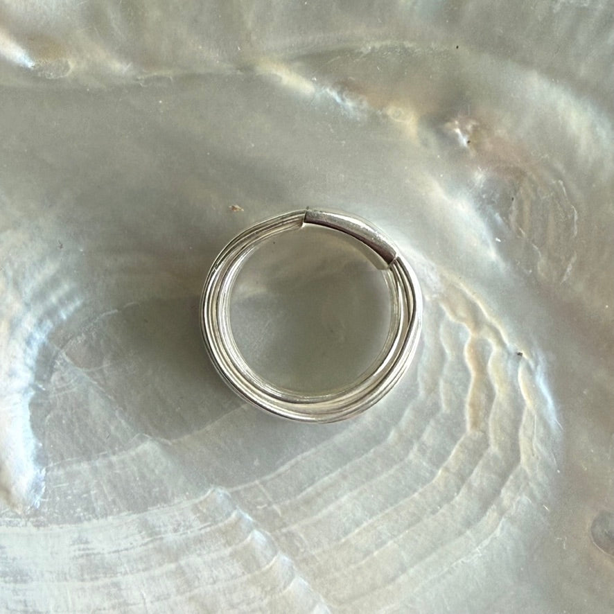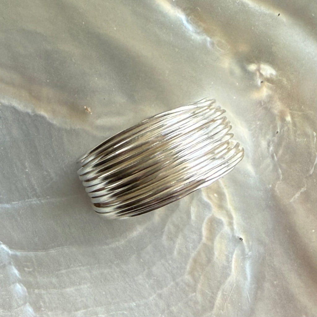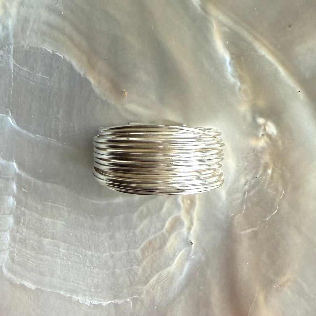 Layers of silver wire, encircling the finger